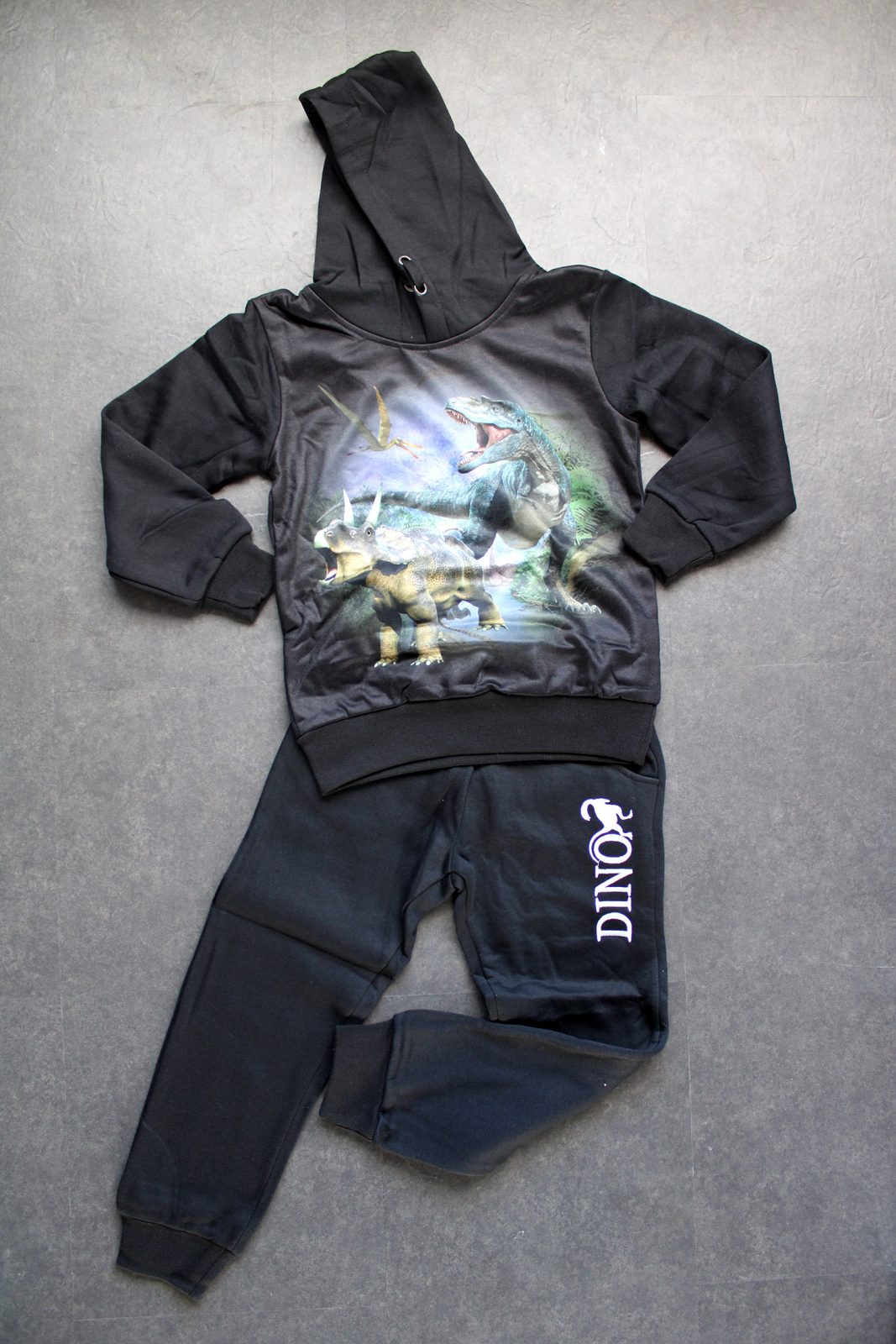 Voor onze dino-fans, zwarte hoodie met afbeelding van dinosaurussen en bijpassend zwarte jogging broek. In maat 86/92 tot en met 146/152.