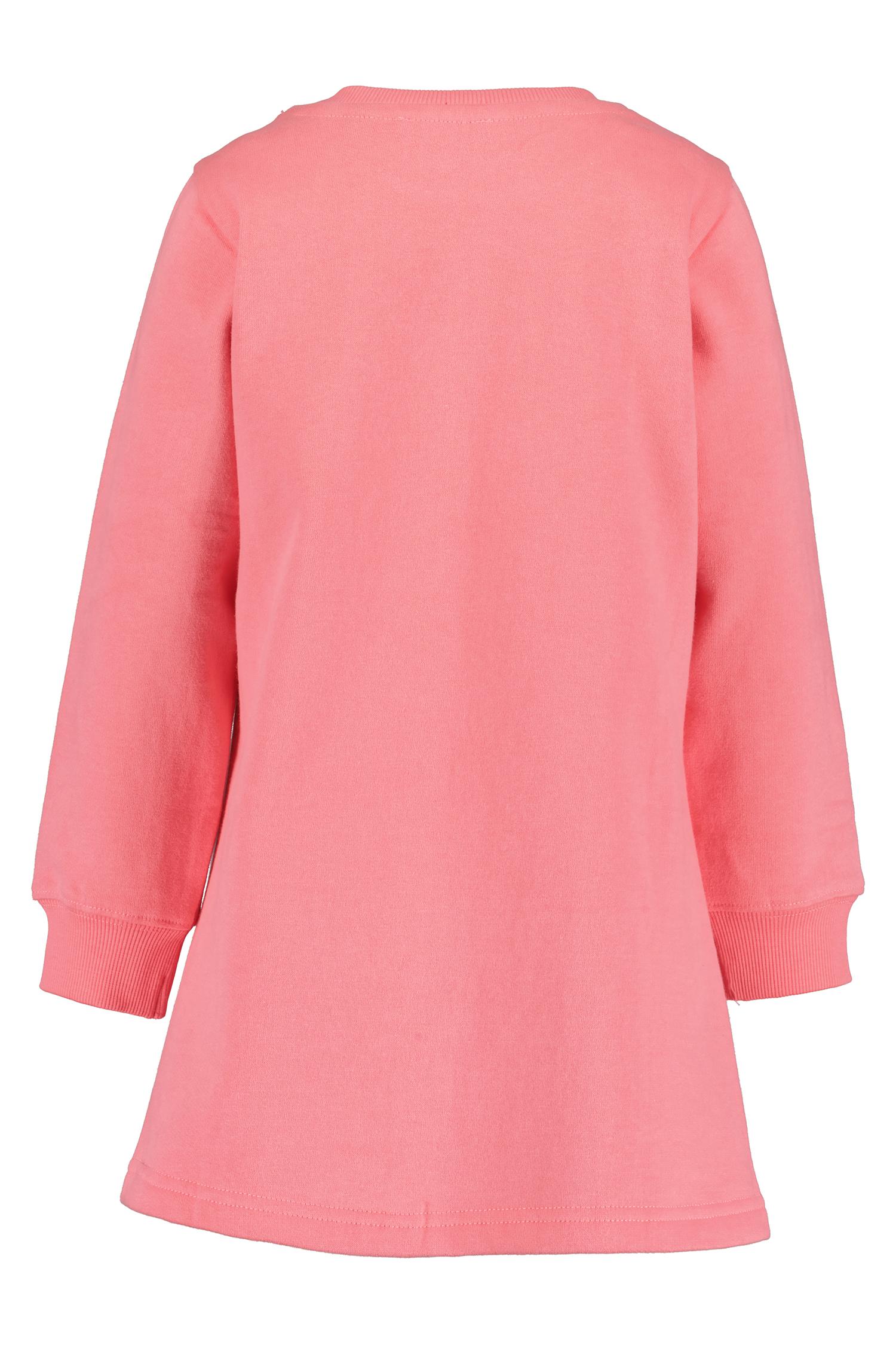Roze jurkje van Blue Seven met afbeelding van een eenhoorn op een regenboog. In het roze en grijs. In maat 92 tot en met 128.