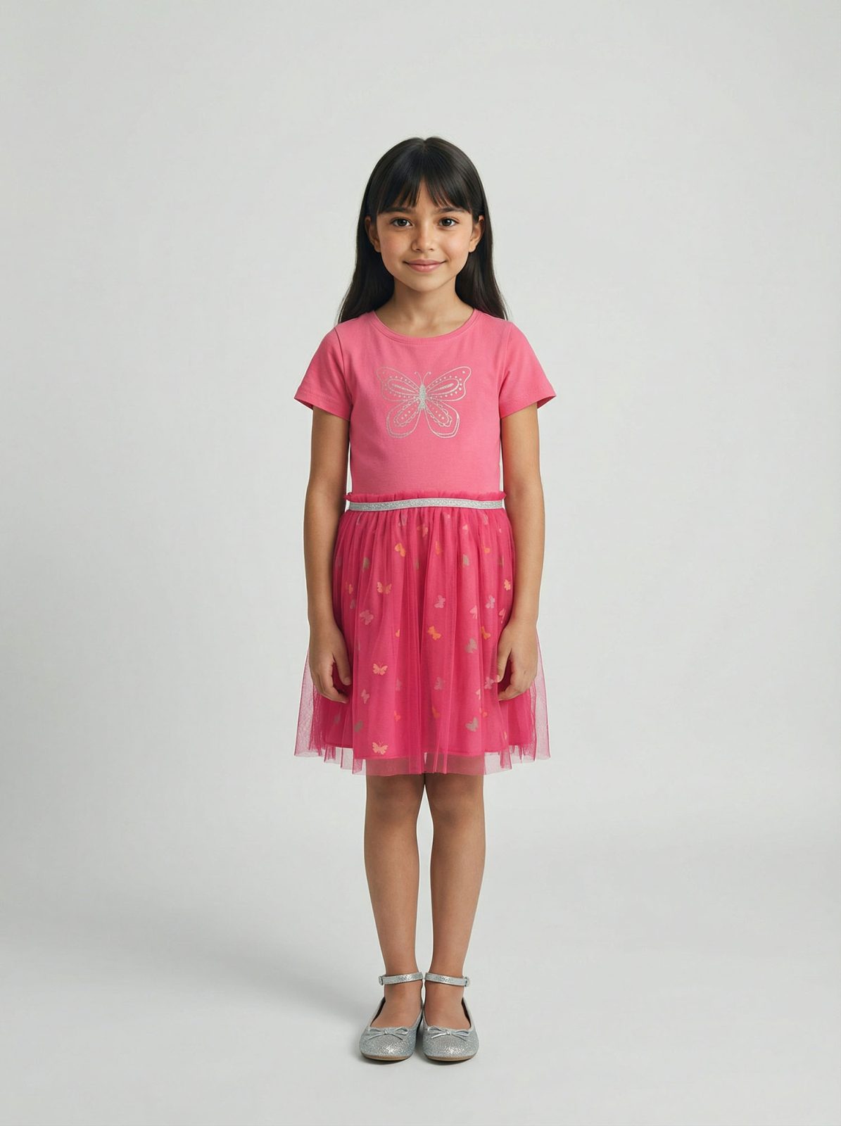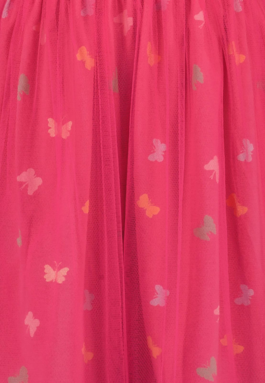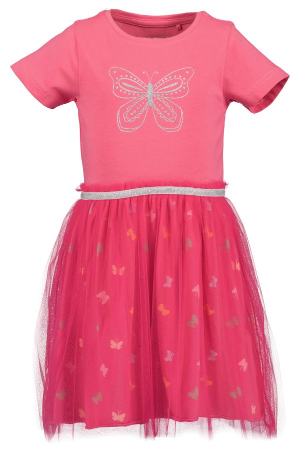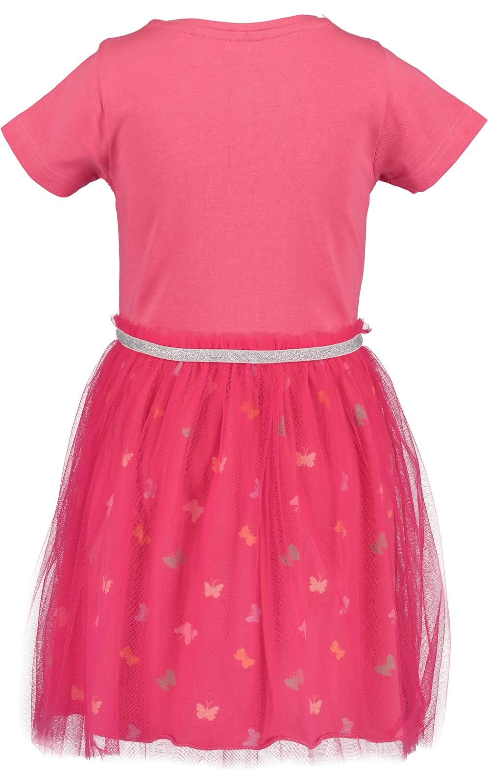Mooi roze jurkje van Blue Seven met afbeeldingen van gekleurde vlinders en tule rokje. In maat 98 tot en met 134.