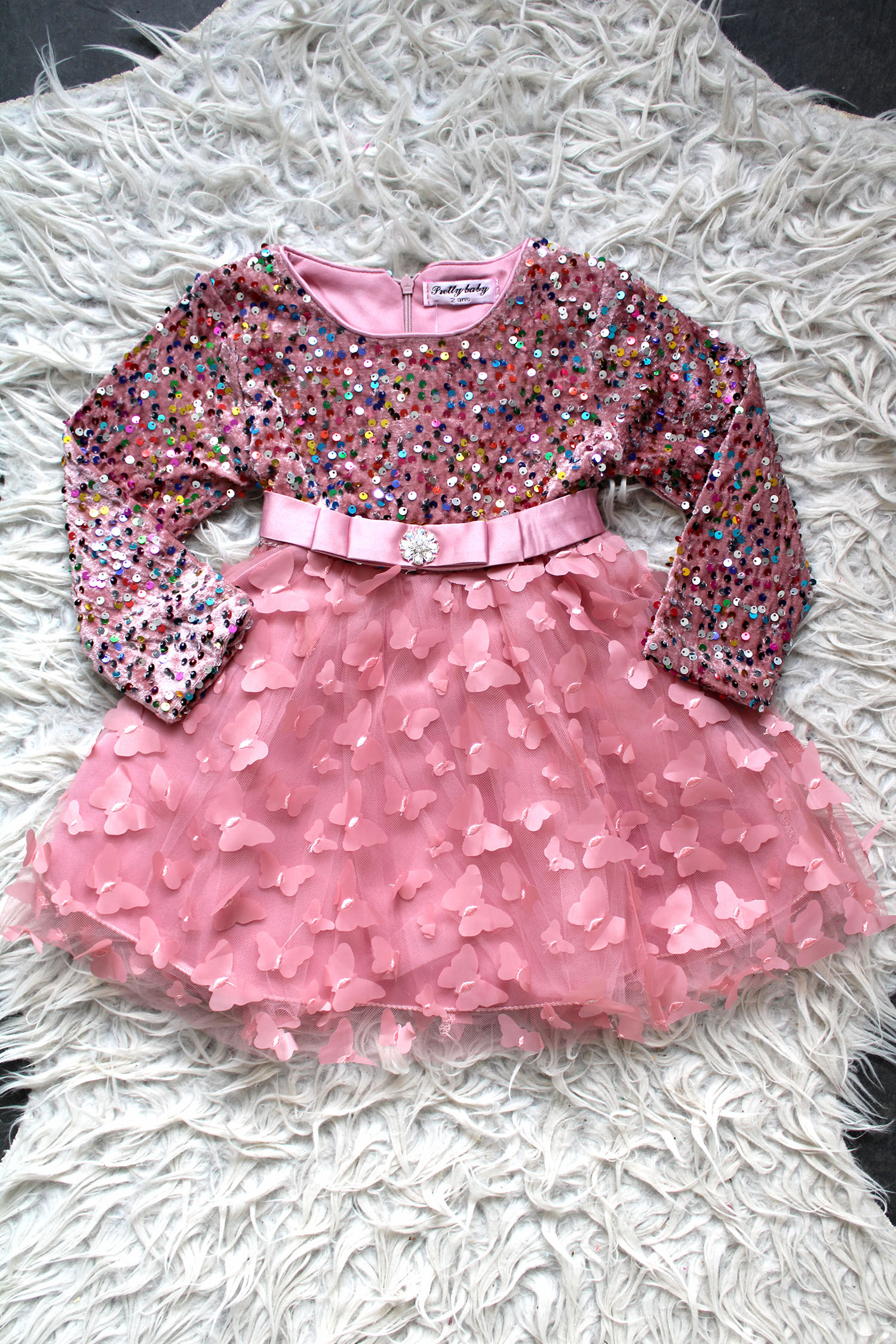 Wauw! Super mooi glitter jurkje met lange mouwen, tule rokje met vlinders. De jurk heeft een rits en is in maat 86 tot en met 152. In het roze, donkerblauw, goudkleurig en rood.