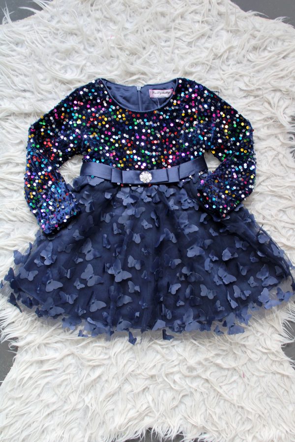 Wauw! Super mooi donkerblauw glitter jurkje met lange mouwen, tule rokje met vlinders. De jurk heeft een rits en is in maat 86 tot en met 152. In het roze, donkerblauw, goudkleurig en rood.
