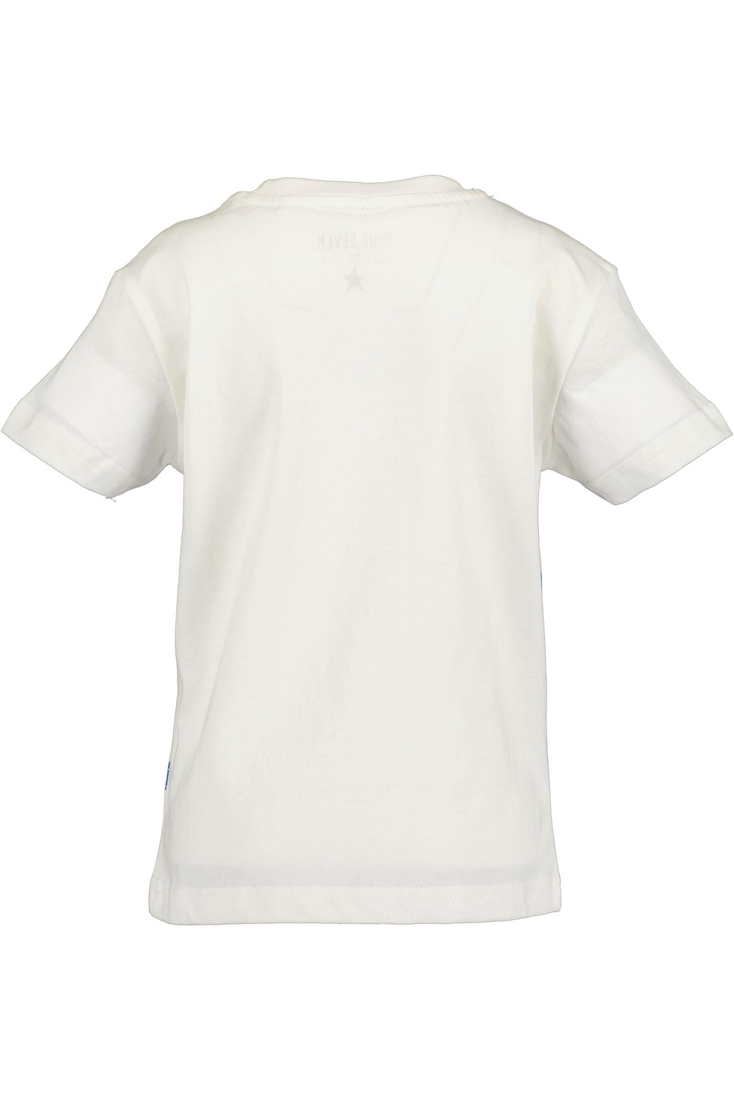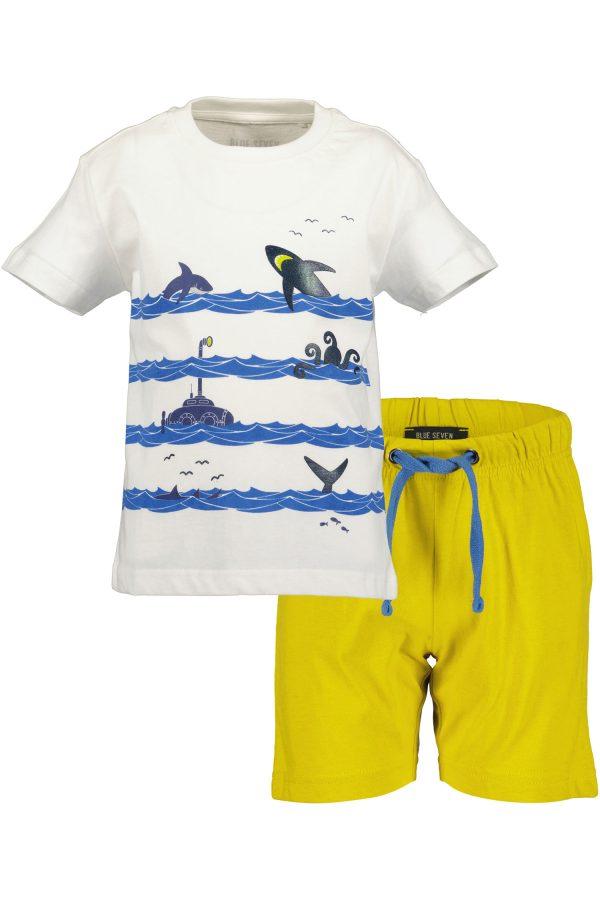 Leuke kledingset van Blue Seven. Wit t-shirt met afbeeldingen van water en haaien met een bijpassend gele korte broek. In maat 98 tot en met 134.