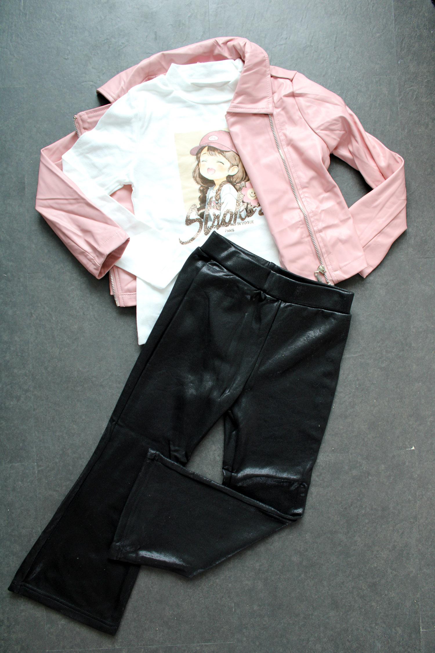 Stoere kledingset bestaand uit een jasje met ritsjes, glitter flair broekje en een shirtje met lange mouwen. De jasjes zijn in de varianten lichtroze, zwart en beige. In maat 98 tot en met 152.
