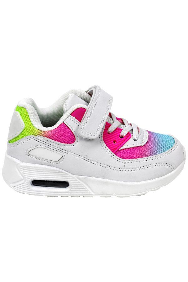 Te gekke witte veter sneakers met rainbow in maat 24 tot en met maat 35! Witte sneakers met felroze bij de veters, geel bij de hak en blauw bij de neuzen. De maten 24-29 hebben elastische veters en klittenband, super handig!