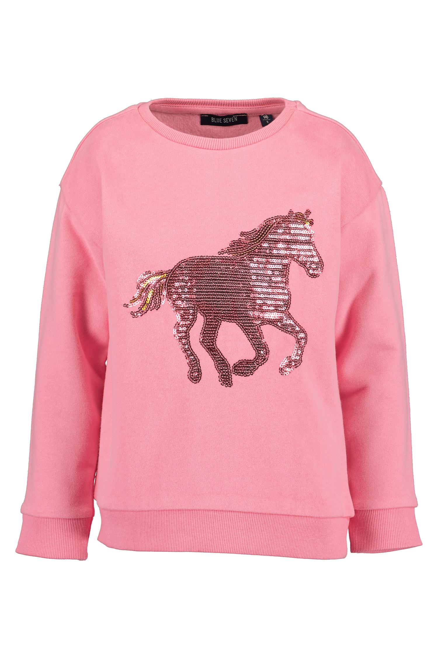 Gave sweater van Blue Seven met een galopperend paard in glinsterende pailletjes. Maat 92 tot en met maat 128.